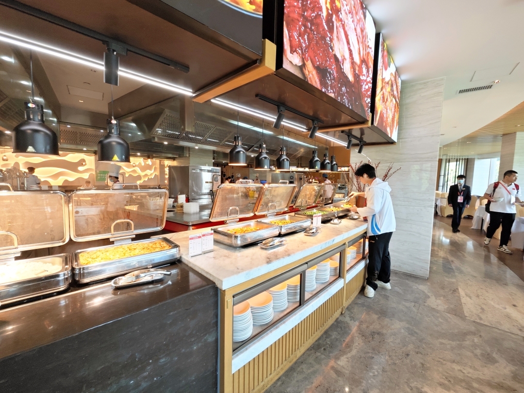 酒店内,设立了独立的运动员餐厅,所有食材均来自市执委指定供应商,确保源头可溯,严格遵循反兴奋剂规定,同时兼顾各地运动员的口味,做到科学营养与美味可口并存。